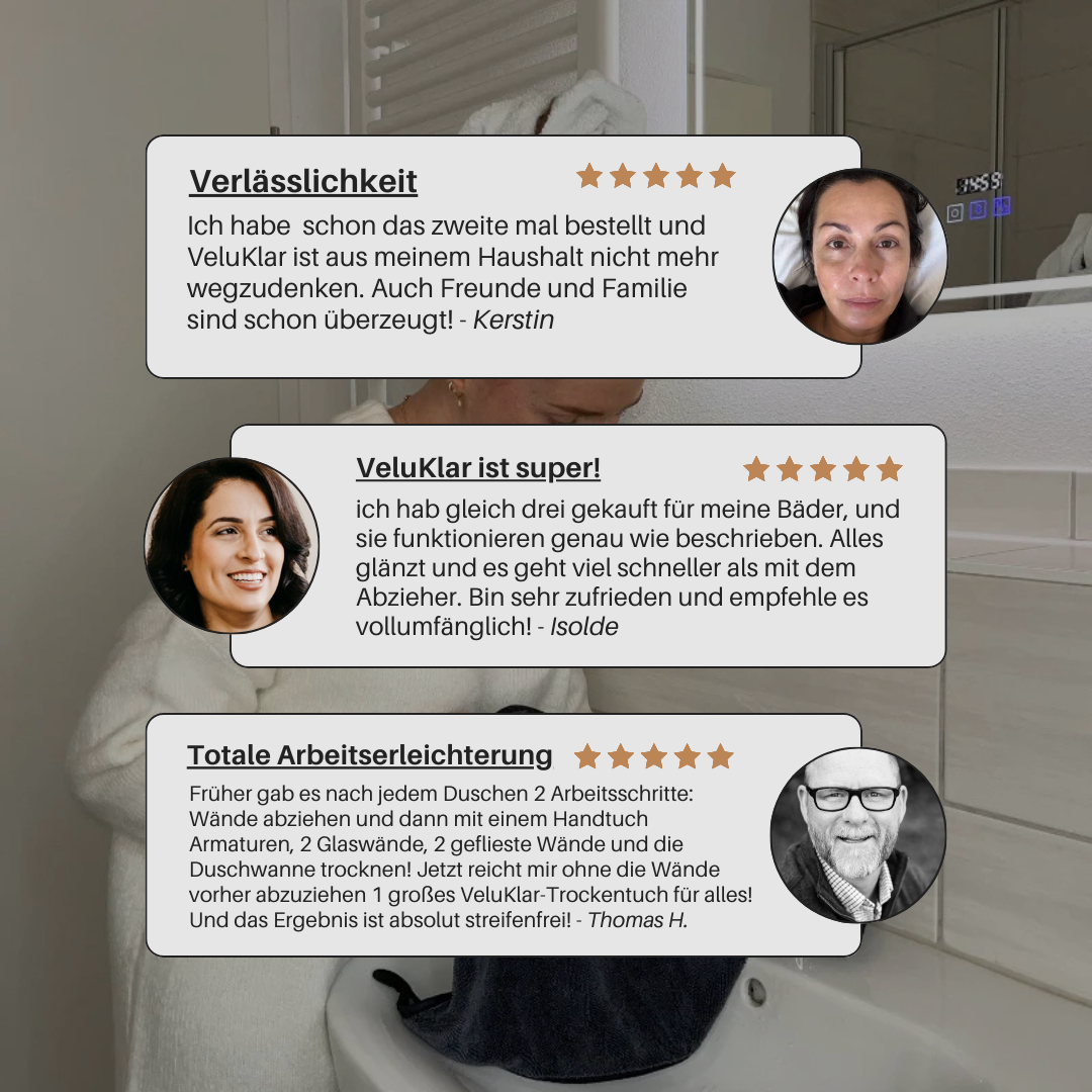 Wir sind überzeugt, dass VeluKlar dein Bad revolutionieren wird. Falls du nicht vollständig zufrieden bist, kannst du dein Tuch innerhalb von 30 Tagen zurücksenden und erhältst den vollen Kaufpreis erstattet – ohne Risiko und ohne Kompromisse. Über 15.000 zufriedene Kunden vertrauen bereits auf unsere hochwertige Qualität. Teste VeluKlar ganz ohne Risiko und erlebe den Unterschied.